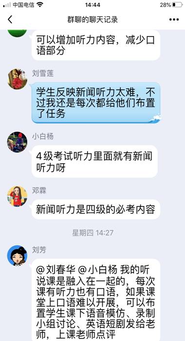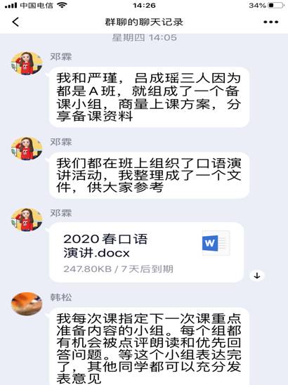 接着,老师们纷纷加入讨论,积极分享了自己所使用的在线教学软件,比如:腾讯会议、QQ电话、腾讯课堂、口语FiF系统、QQ作业等,就各种软件的使用方法和局限性,老师们各抒己见,建言献策。