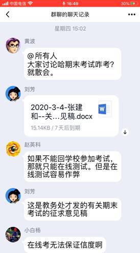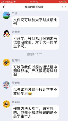 最后,老师们围绕在线期末考试何时进行、如何进行、不可控因素以及平时成绩构成和占比等问题进行了热烈讨论。考虑到很难保证远程在线测试的信度和效度,老师们认为,如果5、6月份员工能够返校,期末考试可以按原计划进行;如果员工届时不能返校,建议期末考试延期至9、10月份正常开学之时进行。
