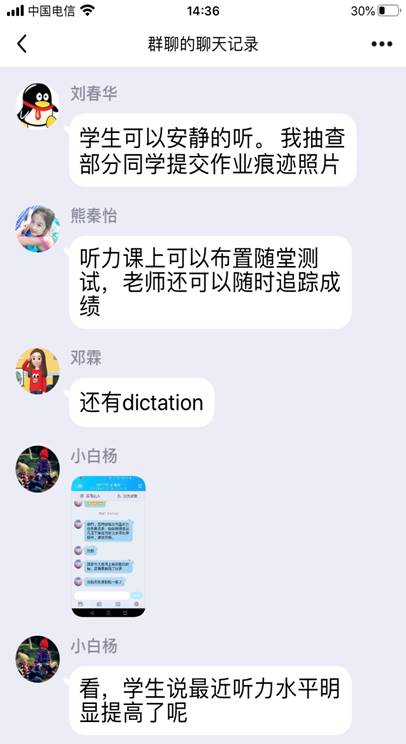 随后,老师们就口语和听力教学进行了交流。教研室副主任邓霖老师首先分享了A班口语教学方案,韩松老师介绍了分组练习和全班互动模式,严瑾老师建议使用“QQ电话”进行口语对话。在听力教学方面,老师们一方面布置员工自主学习We Learn随行课堂上的新闻听力内容,一方面使用国家级规划教材《新世纪听力训练2》的扫描件和音频文件给员工上课,员工把自己做的听力练习答案上传到iWrite系统里或拍照发到QQ作业中。虽然老师们给员工布置的听力练习较多,员工们都不折不扣地完成了,老师们针对员工做错的地方重点讲解,员工反馈说听力提高了不少。