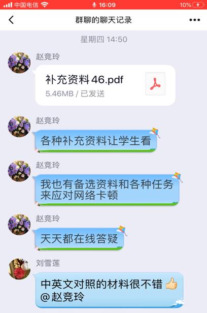 关于读写译教学,老师们反映,虽然WE Learn随行课堂也有瑕疵,但是不影响同学们主动学习。赵竞玲老师分享了附有中文翻译的英文阅读材料。刘芳老师介绍了如何借助员工助教的力量加强在线教学管理。赵英科老师分享了如何利用WE Learn 随行课堂进行在线测试。