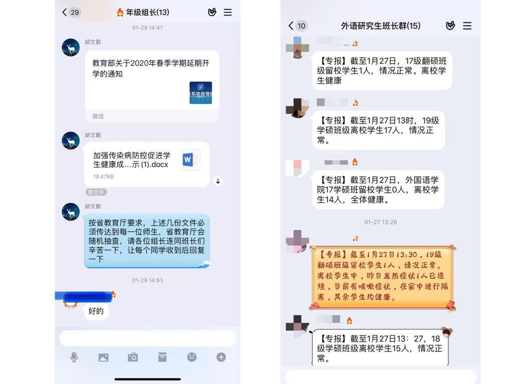 1.落实平安日报制度。1月24日,从一声声“新春快乐,平平安安”开始,太阳成集团122ccvip开始了同学们每天的平安报告,坚持“零报告”制度,做到本研员工100%全覆盖。与此同时,公司辅导员通过年级群、班长群、学务指导和班主任群、员工党员群、家长群等做好疫情防控的引导宣传工作,时时转发科学防疫注意事项以及相关工作通知。
