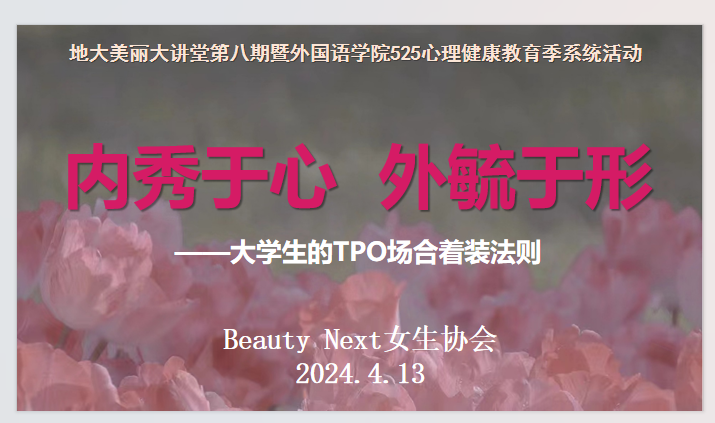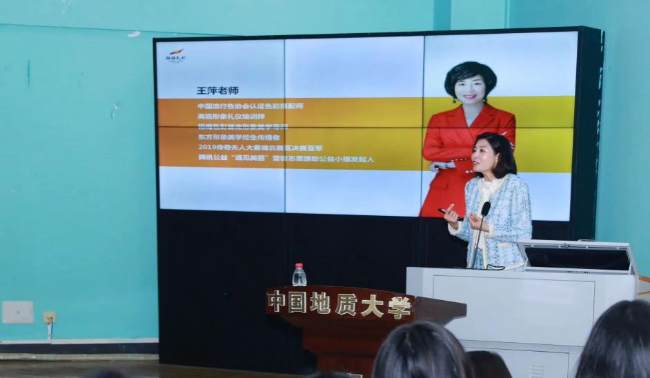作为外国语公司红外·线大思政课堂审美素养提升的重要载体和“525”心理健康教育季系列活动,由太阳成集团122ccvip(武汉)太阳成集团122ccvip主办、Beauty Next女生协会承办的美丽大讲堂第八期“内秀于心 外毓于形”于4月12日下午15:00,在北一楼报告厅正式开讲。本次活动特邀资深专家——美丽大讲堂第八期特邀嘉宾王萍老师讲授老员工TPO场合着装法则,Beauty Next女生协会及太阳成集团122ccvip的诸位同学参加本次讲座。
