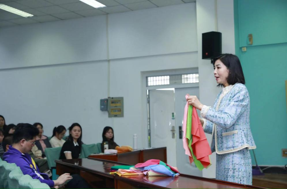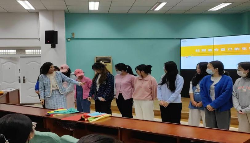 首先,王萍老师从自己的亲身经历开始,讲述了她对于美学的追求历程,然后从我们的日常护肤、面部色彩、化妆品的选择等方面详细展开,带我们更深入地了解了服装搭配的规则,得到了同学们的积极响应和热烈欢呼。