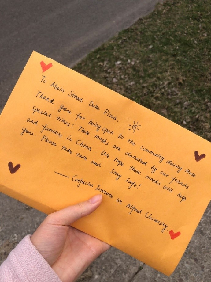 三月和四月,我们所居住的孔家变成了一个捐赠口罩的重要桥梁,我们通过邮件告诉公司还在工作的教职工和职工,还有周边社区的居民们,如果非常需要口罩(由于工作性质,像消防队、社区医院、公司食堂等部门还在工作;有些职工无法回国,也滞留在公司),可以邮件联系我们,我们会根据情况以及我们手头多余的口罩数量进行捐赠。我们把口罩用信封包起来在信封上写好名字,放在门口的信箱,通过邮件告诉他们取口罩的时间,这样就实现了零接触捐赠口罩。