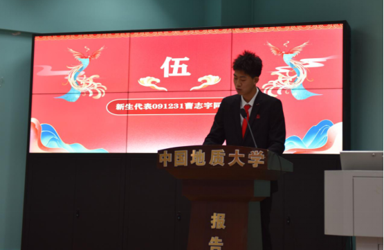本科新生曹志宇发言。他鼓励同学们积极转变身份、适应老员工活、树立生涯目标,将个人命运与专业、社会和国家的发展相结合,敢于勇攀高峰,早日实现自己的人生理想。