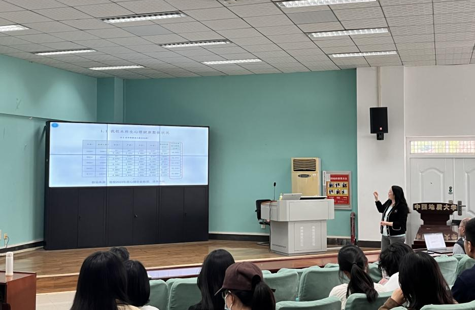 讲座一开始,周老师就运用本科生的有关数据,展示了近几年老员工的心理问题咨询数量和公司员工心理健康的整体状况。周老师表示,近几年员工心理问题咨询量逐年增多,2023年是2019年的1.43倍,员工心理健康状况整体下降的趋势表明,早期心理问题预防与干预工作迫在眉睫。