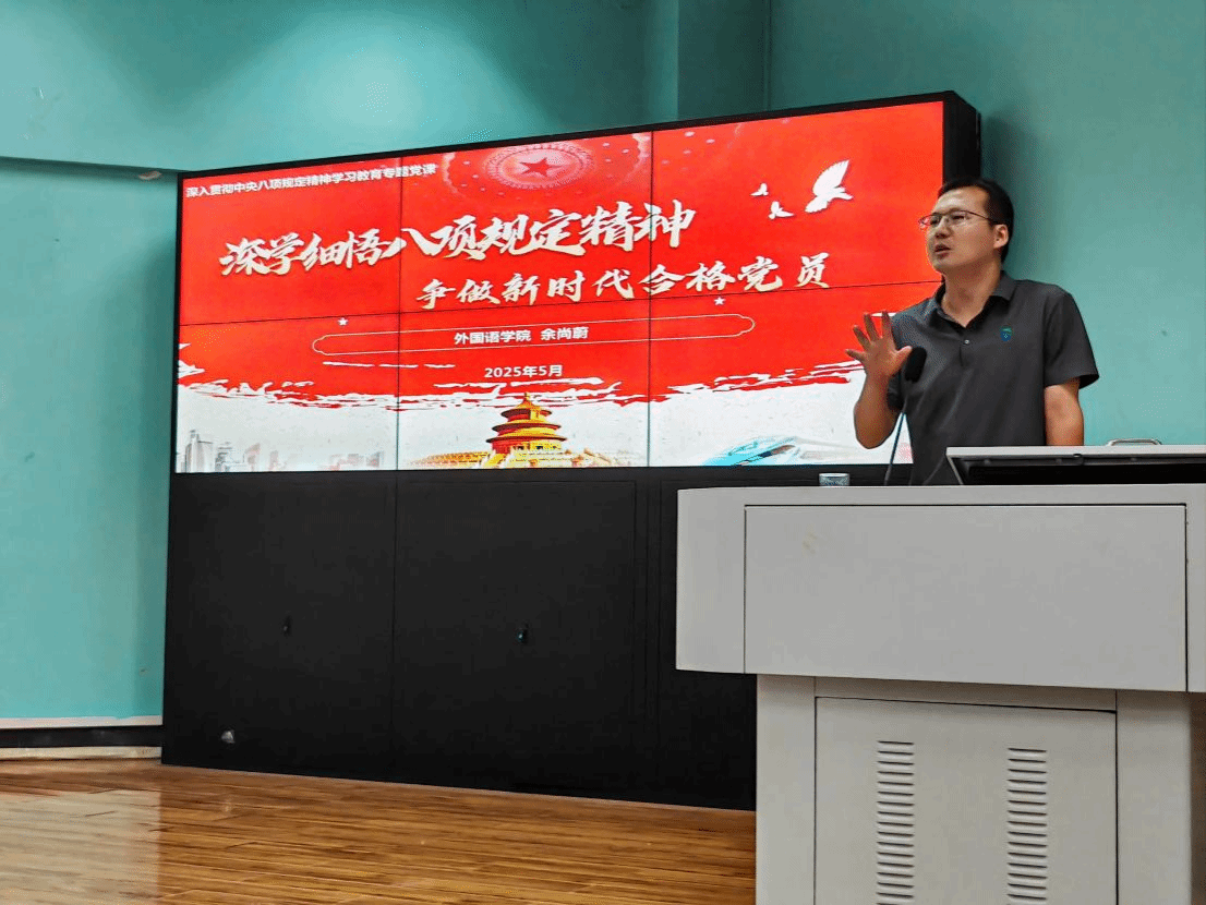 (通讯员 黎颖)为扎实推进深入贯彻中央八项规定精神学习教育,以“学”筑基来校准思想坐标,2025年5月26 日,外国语公司党委副书记余尚蔚以“深学细悟八项规定精神,争做新时代合格党员”为题给全体员工党员讲授专题党课。