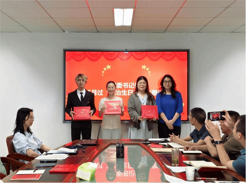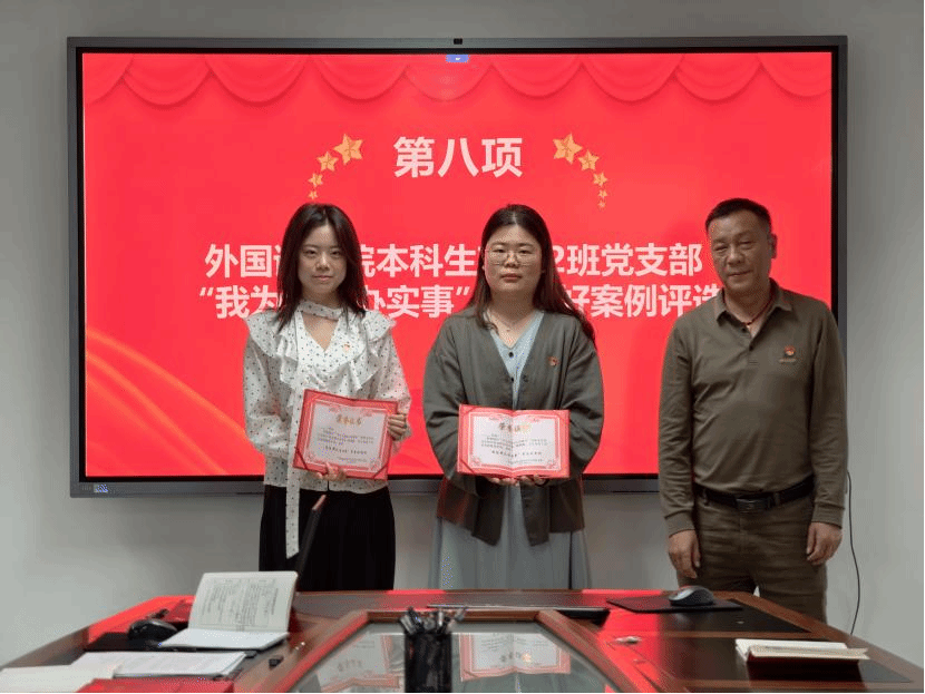在员工党支部“我为群众办实事”月度好案例评选环节,支部全体党员分享他们在学习、生活中为师生办实事、解难题的点滴和感悟,经支部民主评选,陈晓红和毛欣如组织就业分享会和语言志愿服务的两个案例被评为五月“我为群众办实事”好案例,院直党支部宣传委员董成见同志为获奖同志颁发证书。