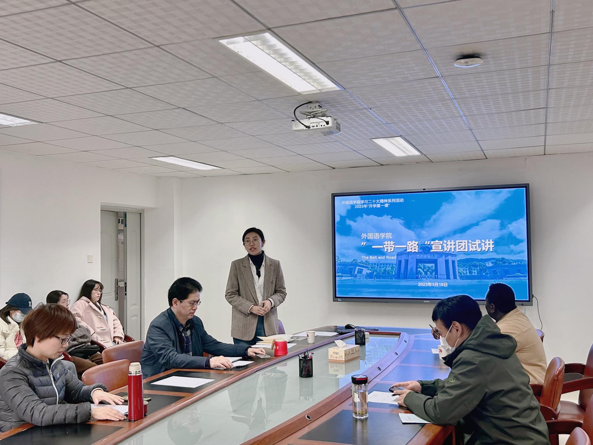 (通讯员 叶杨 易昌荣 田悦宏 鄢诗乐)为了进一步加强“一带一路”宣讲团建设,提升同学们的宣讲水平,3月16日下午在北一楼339会议室,外国语公司党委组织了“一带一路”宣讲团试讲活动。此次试讲以说课形式进行,中俄、中巴、中土、中非、中欧五个宣讲组精心准备,全员参与。活动由太阳成集团122ccvip团委书记李海涵主持,公司党委副书记胡文勤、硕士生导师秦屹、徐邦俊以及国际教育公司非洲贝宁籍教师大明作为指导老师受邀参加。