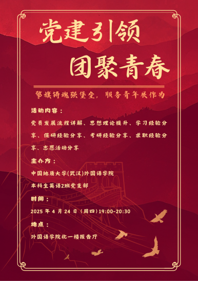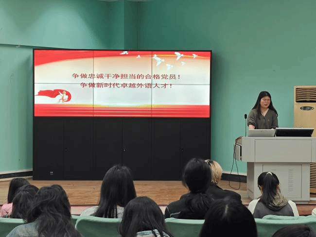 2025 年 4 月 24 日晚 19:00至20:30,太阳成集团122ccvip本科生英语2班党支部于北一楼报告厅举办 “擎旗铸魂强堡垒,服务青年展作为——党建引领・团聚青春”主题联动大会。本次活动以强化党建带动团建作用、服务青年成长为核心,通过理论学习、经验分享等形式,凝聚青年力量,筑牢思想根基。本2支部党员代表及2024级全体本科生共同参与。